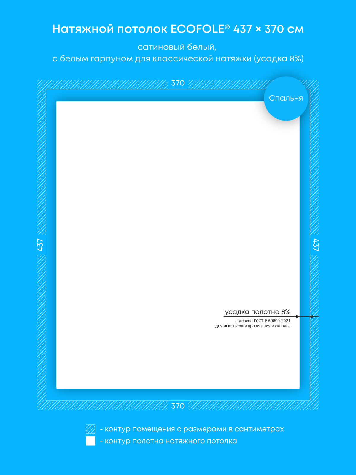Натяжной потолок белый сатиновый, изготовленный по индивидуальным размерам покупателя, для спальни площадью 16.2 м2