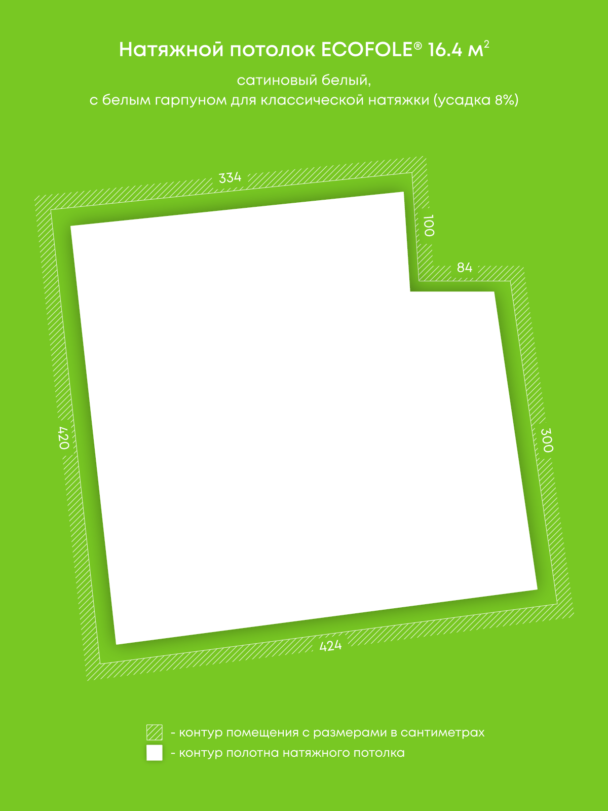 Натяжной потолок белый сатиновый, изготовленный по индивидуальным размерам покупателя, для помещения площадью 16.4 м2