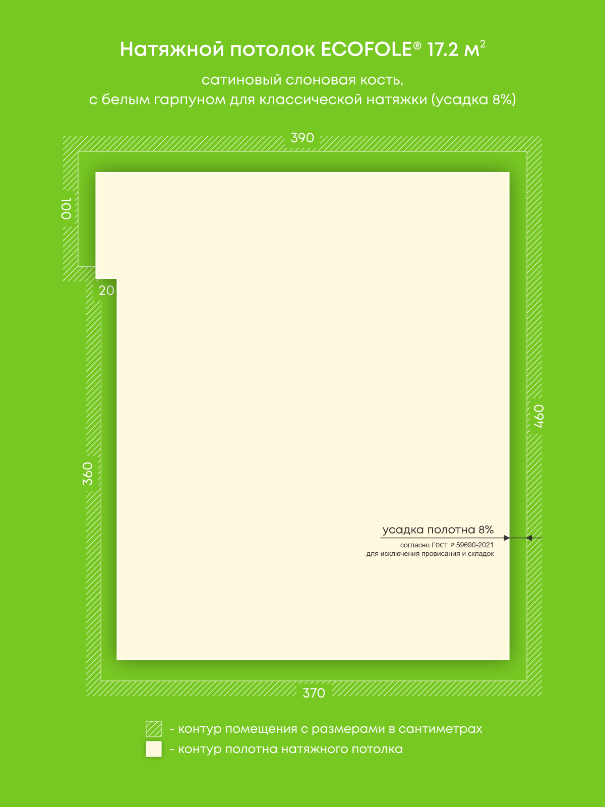 Натяжной потолок слоновая кость сатиновый, изготовленный по индивидуальным размерам покупателя, для комнаты площадью 17.2 м2