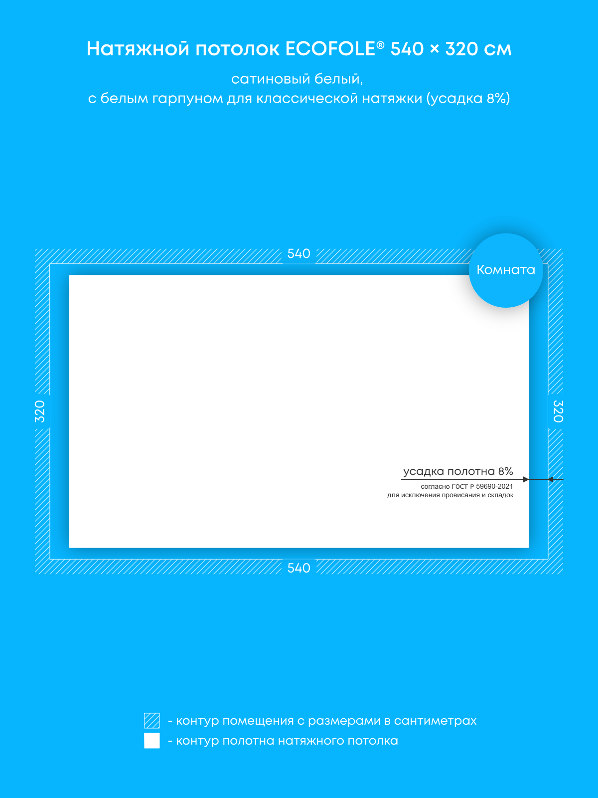 Натяжной потолок белый сатиновый, изготовленный по индивидуальным размерам покупателя, для комнаты площадью 17.3 м2