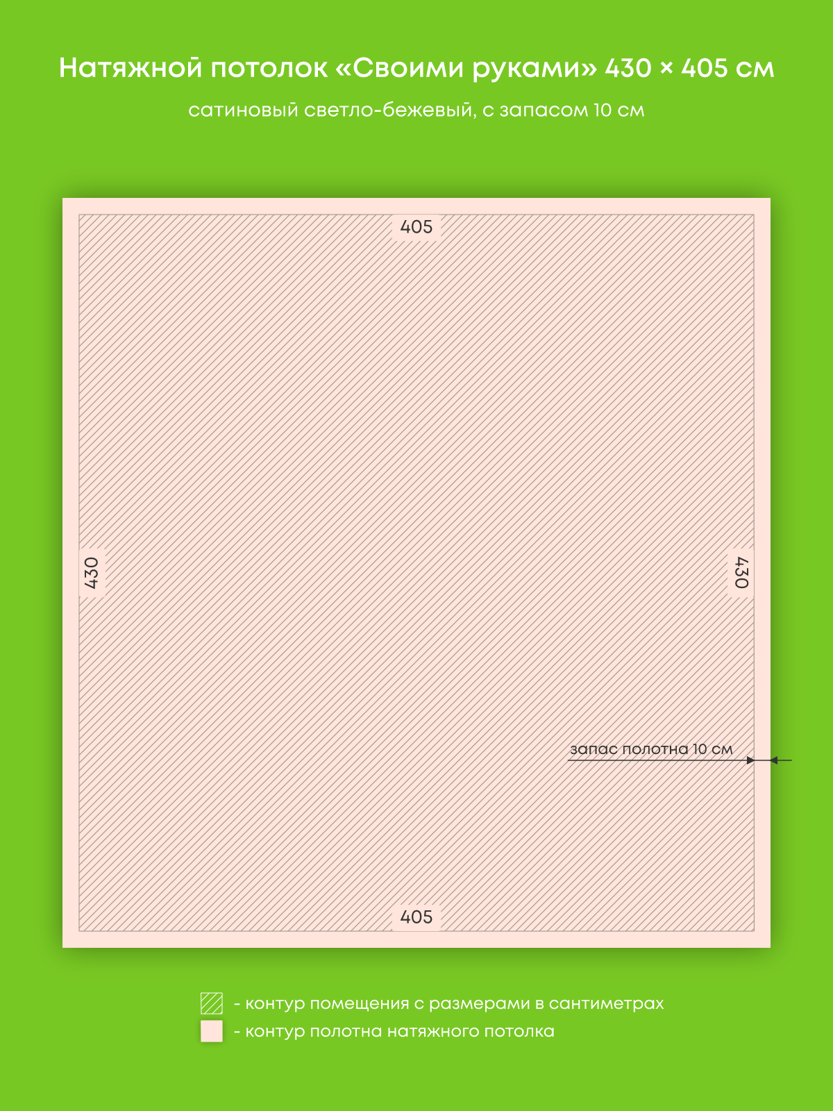 Натяжной потолок светло-бежевый сатиновый, изготовленный по индивидуальным размерам покупателя, для гостиной площадью 17.4 м2