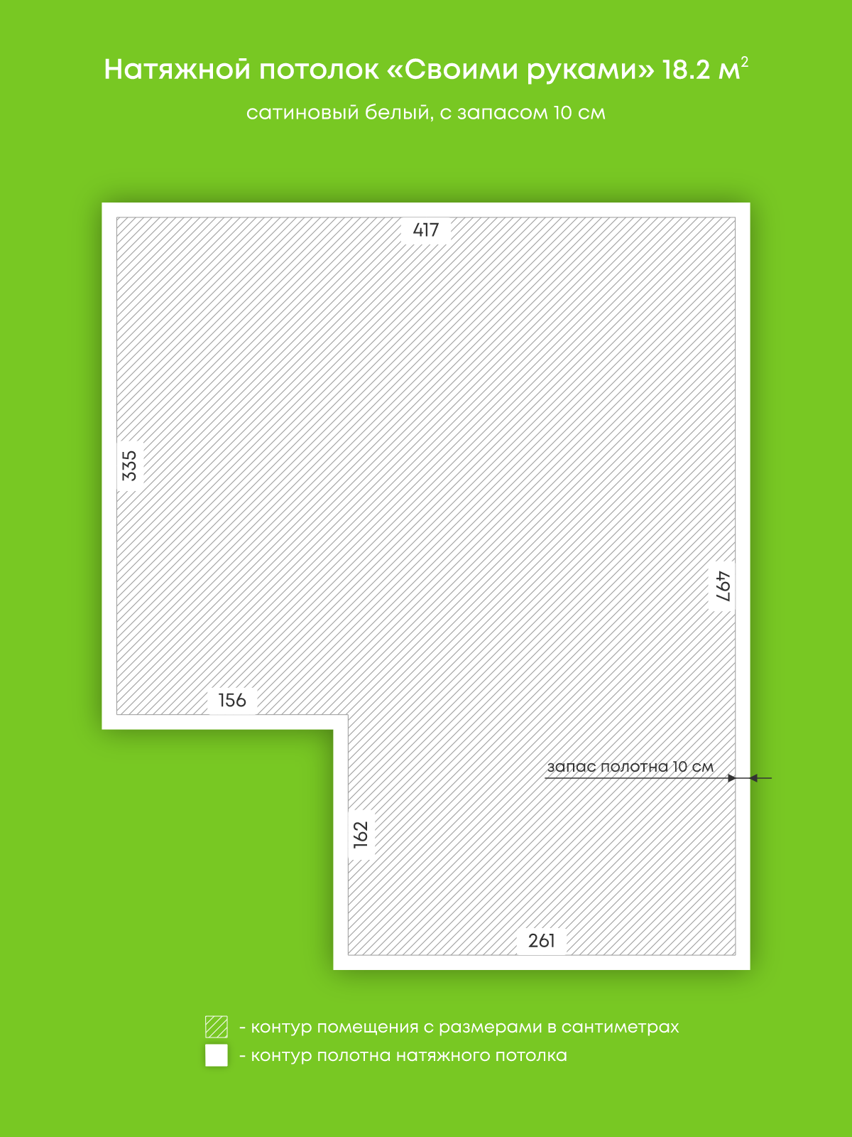 Натяжной потолок белый сатиновый, изготовленный по индивидуальным размерам покупателя, для комнаты площадью 18.2 м2