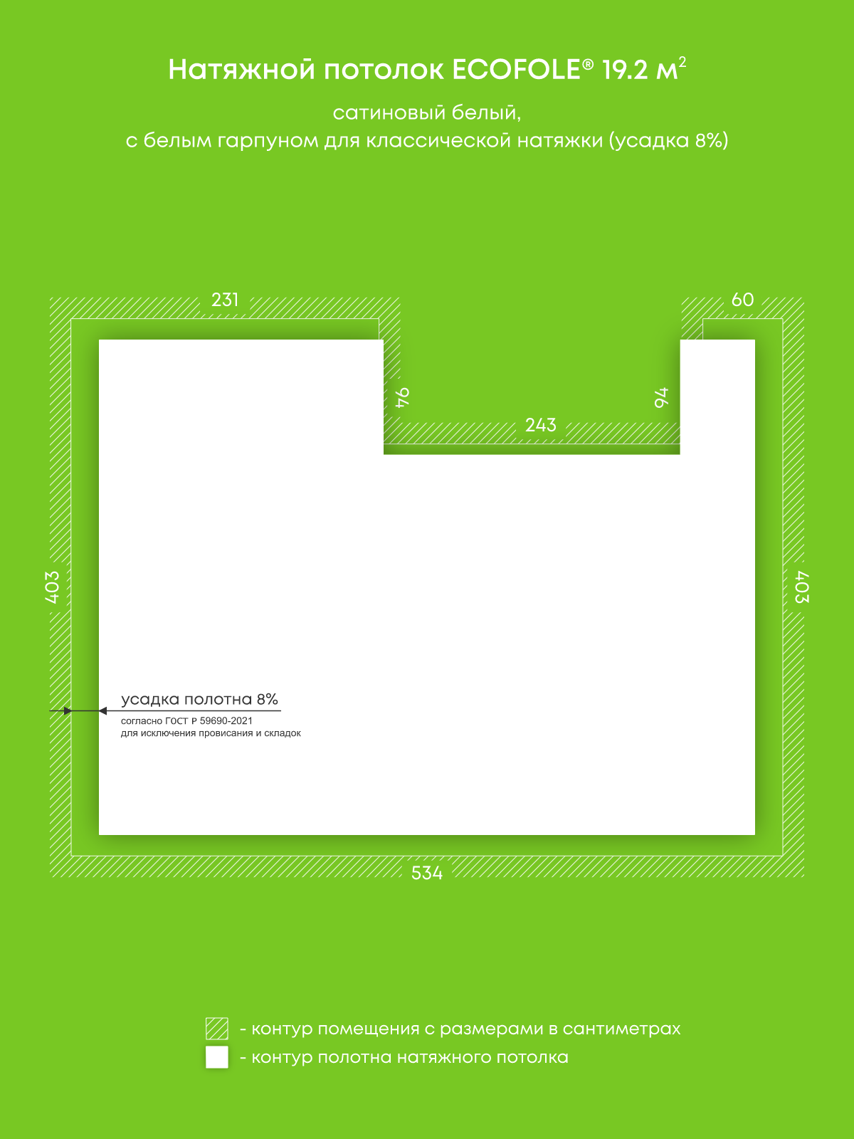 Натяжной потолок белый сатиновый, изготовленный по индивидуальным размерам покупателя, для гостиной площадью 19.2 м2