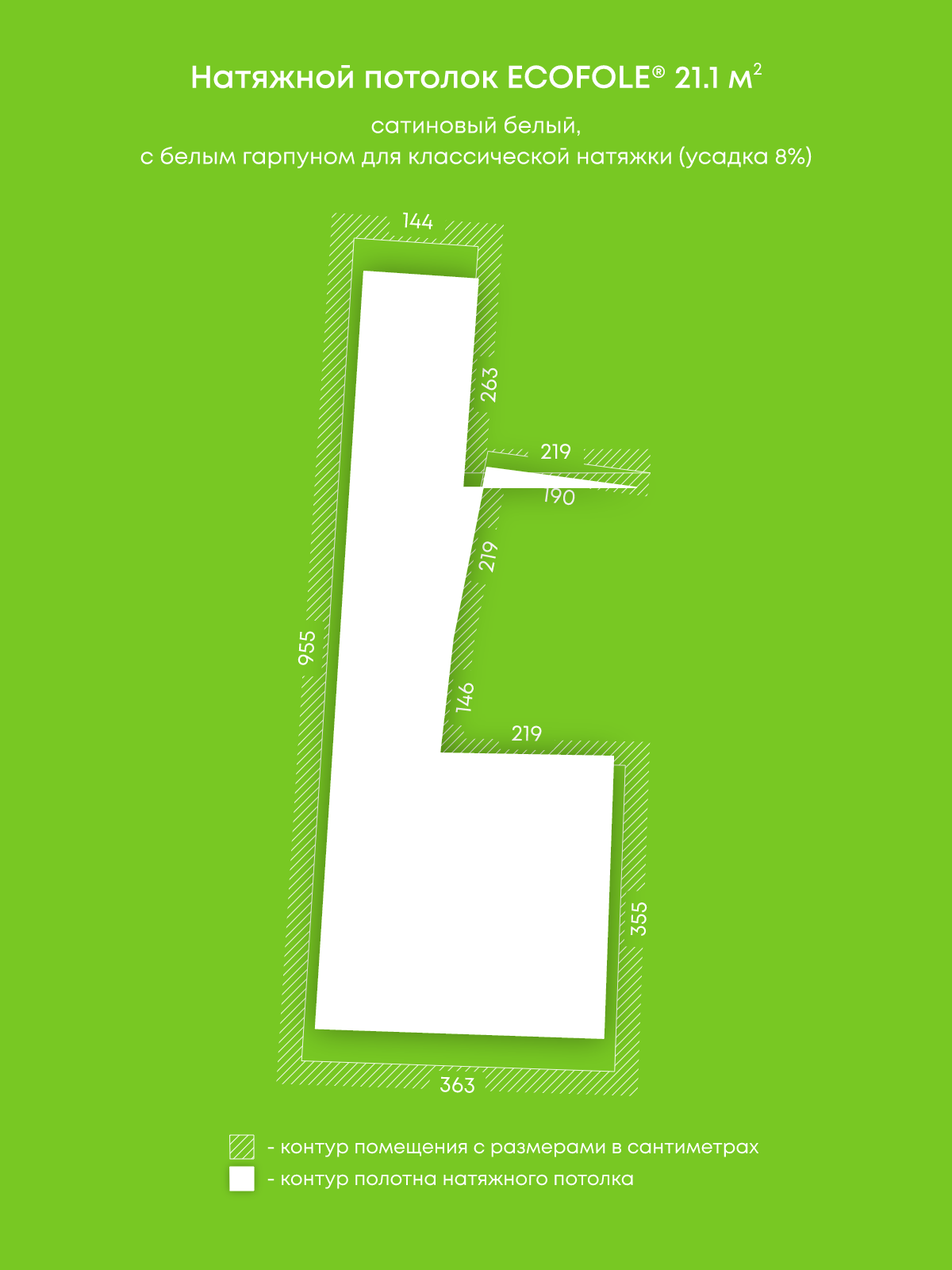 Натяжной потолок белый сатиновый, изготовленный по индивидуальным размерам покупателя, для помещения площадью 21.1 м2