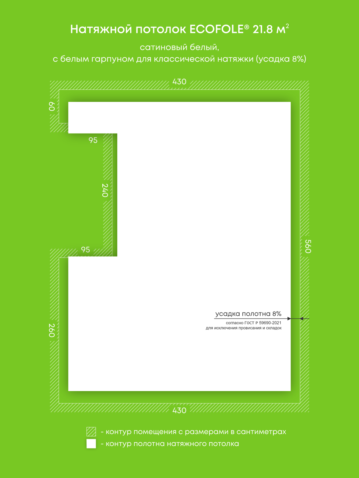 Натяжной потолок белый сатиновый, изготовленный по индивидуальным размерам покупателя, для спальни площадью 21.8 м2