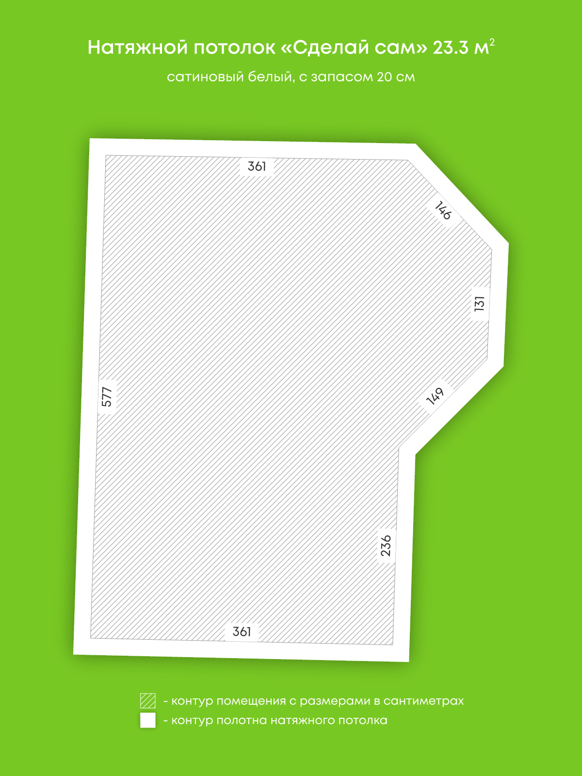 Натяжной потолок белый сатиновый, изготовленный по индивидуальным размерам покупателя, для гостиной площадью 23.3 м2