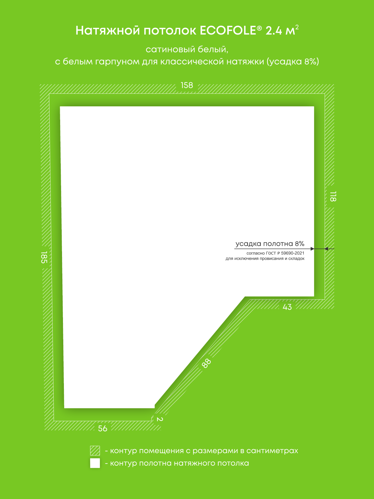 Натяжной потолок белый сатиновый, изготовленный по индивидуальным размерам покупателя, для помещения площадью 2.4 м2