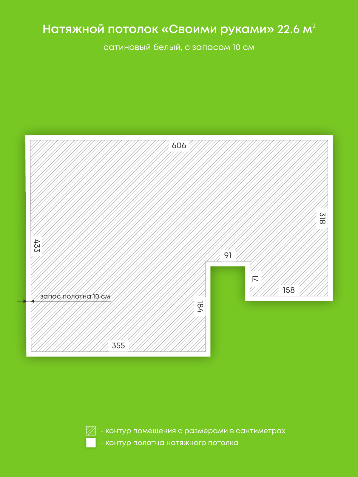 Натяжной потолок белый сатиновый, изготовленный по индивидуальным размерам покупателя, для помещения площадью 24.9 м2