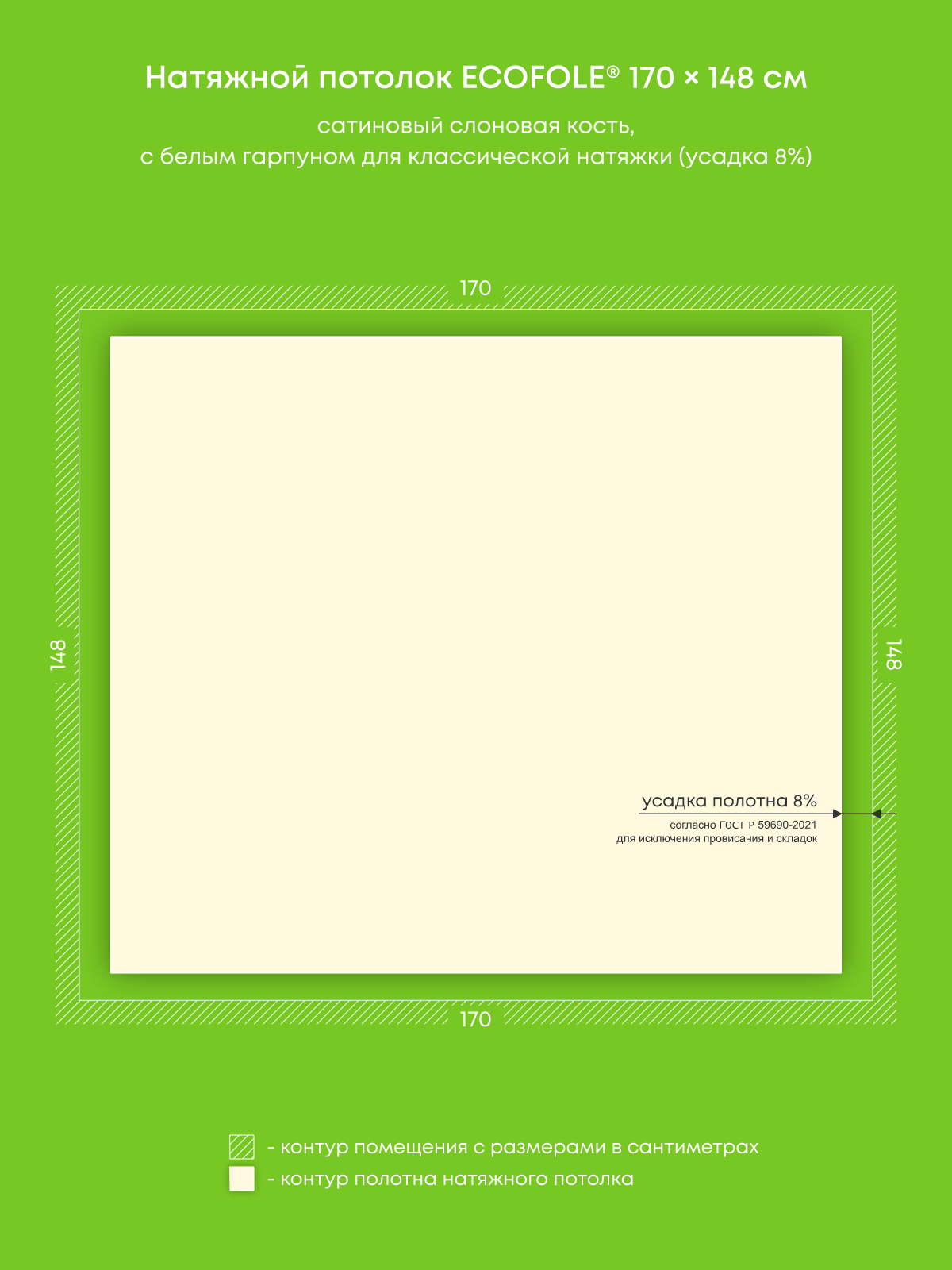 Натяжной потолок слоновая кость сатиновый, изготовленный по индивидуальным размерам покупателя, для ванной площадью 2.5 м2