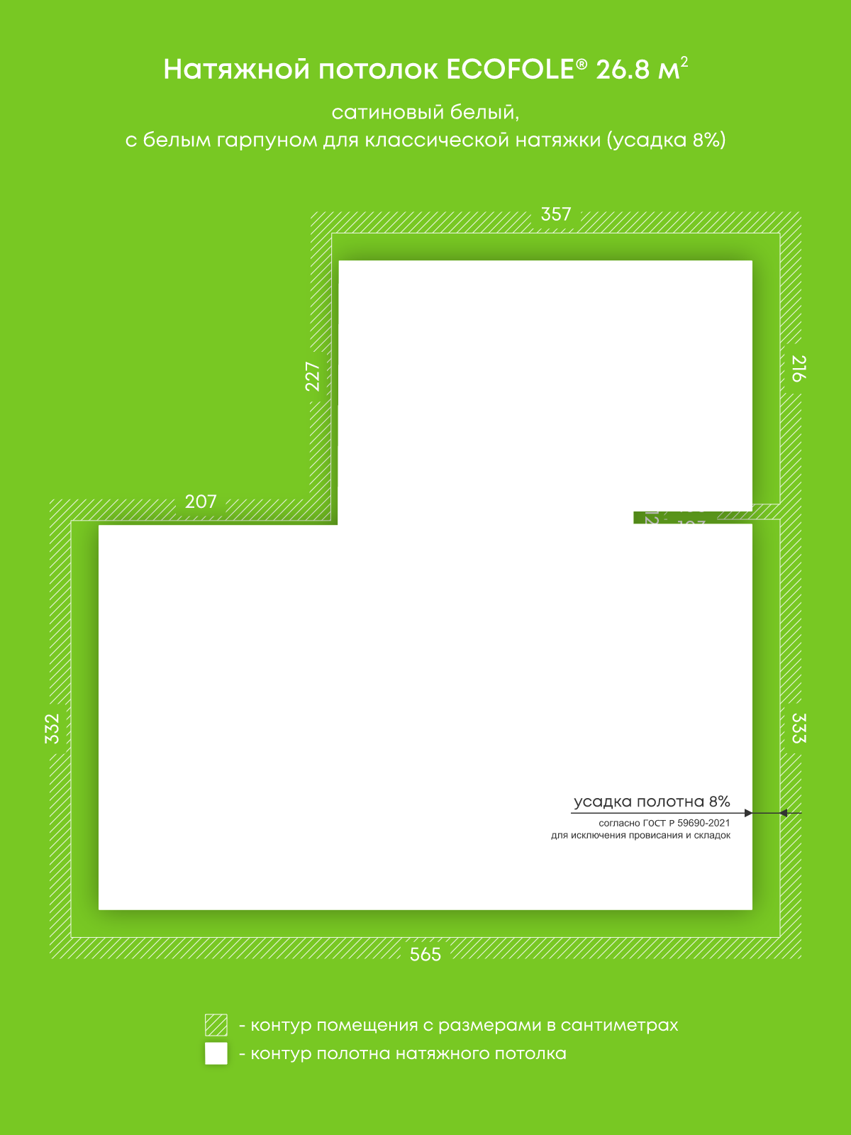 Натяжной потолок белый сатиновый, изготовленный по индивидуальным размерам покупателя, для помещения площадью 26.8 м2