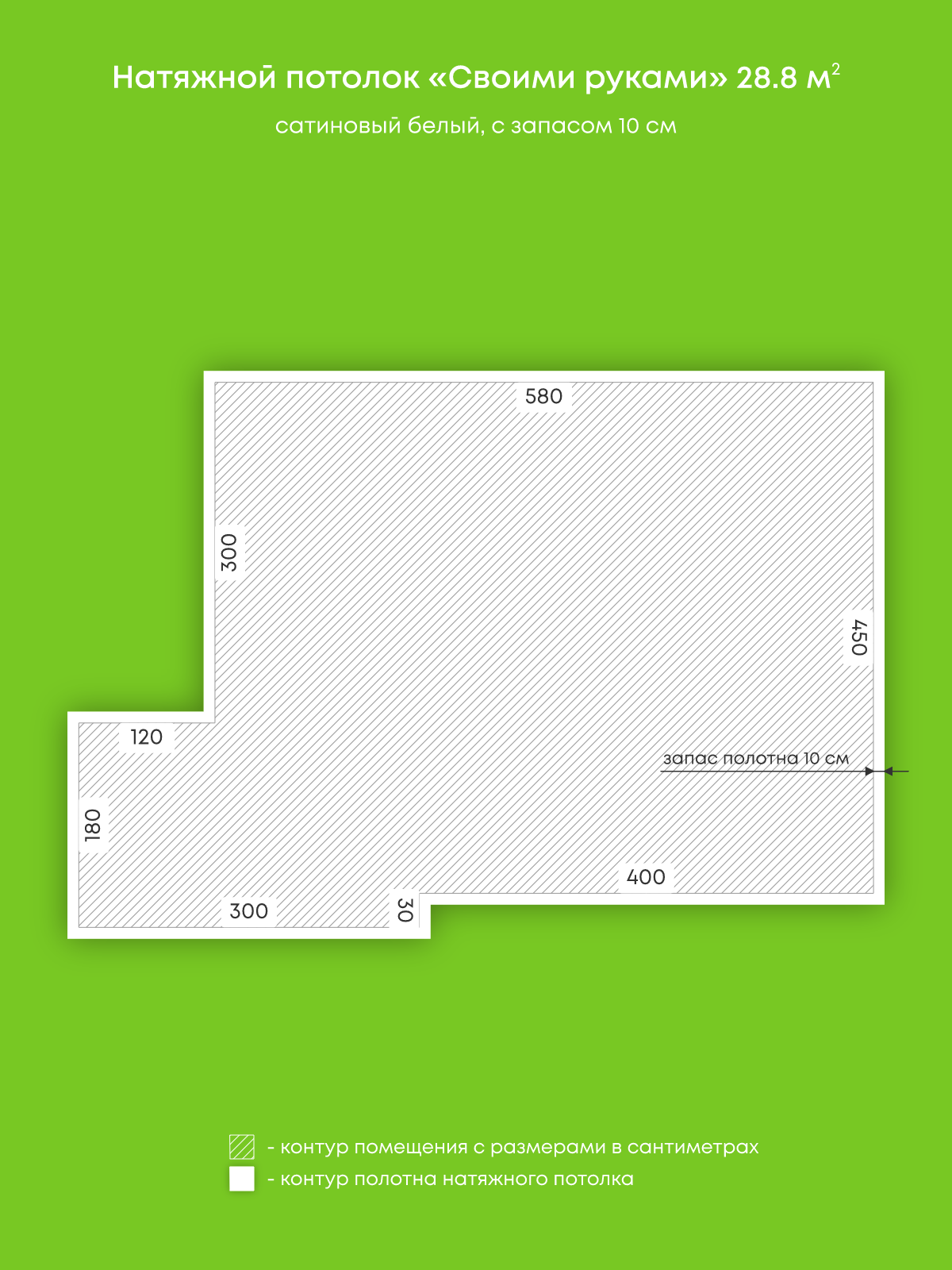 Натяжной потолок белый сатиновый, изготовленный по индивидуальным размерам покупателя, для гостиной площадью 28.8 м2