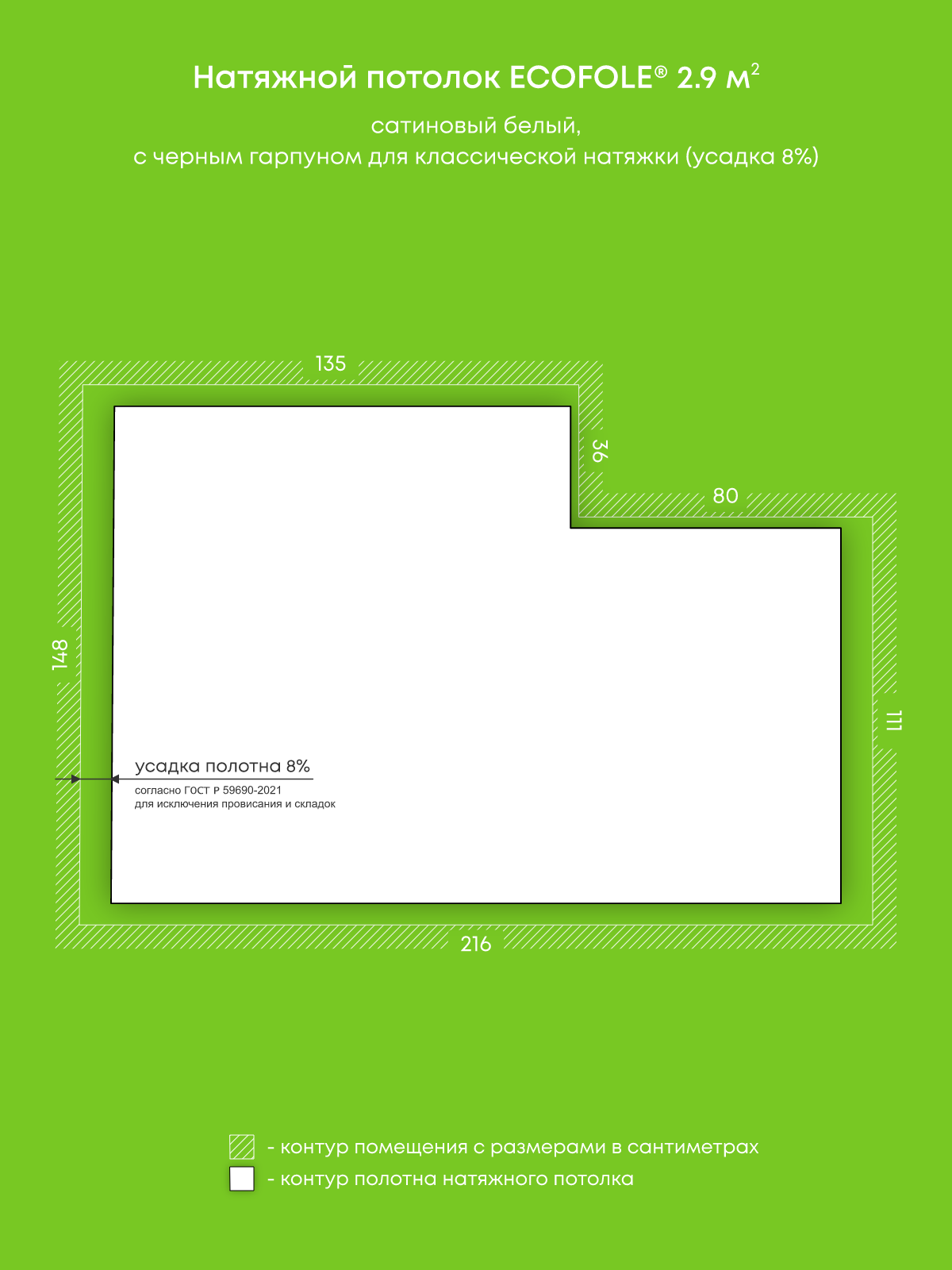 Натяжной потолок белый сатиновый, изготовленный по индивидуальным размерам покупателя, для ванной площадью 2.9 м2