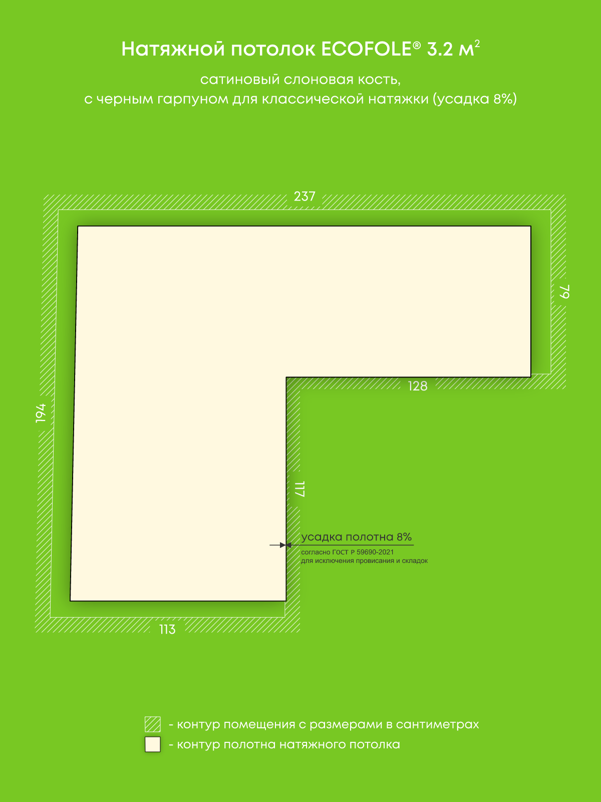 Натяжной потолок слоновая кость сатиновый, изготовленный по индивидуальным размерам покупателя, для помещения площадью 3.2 м2