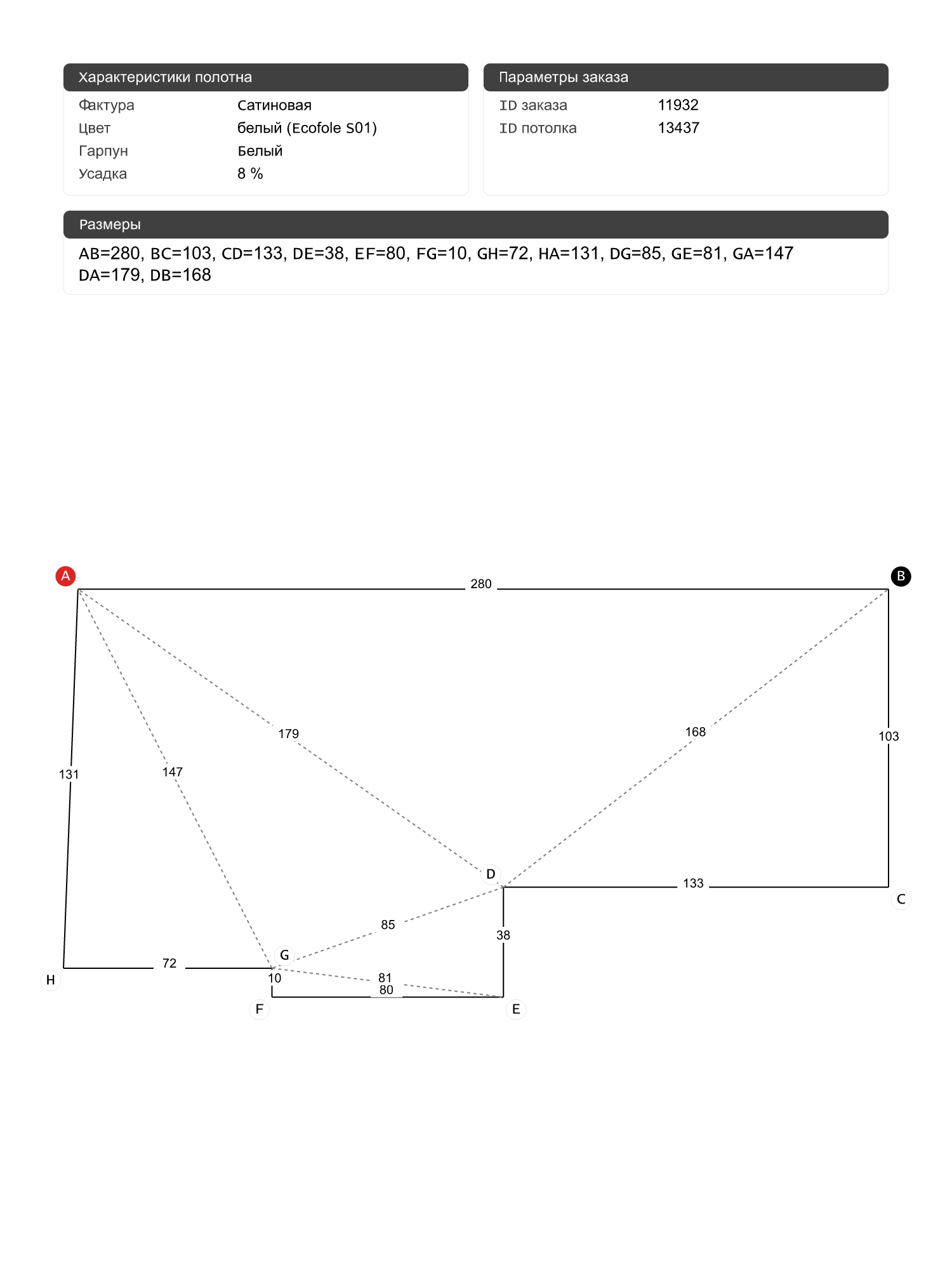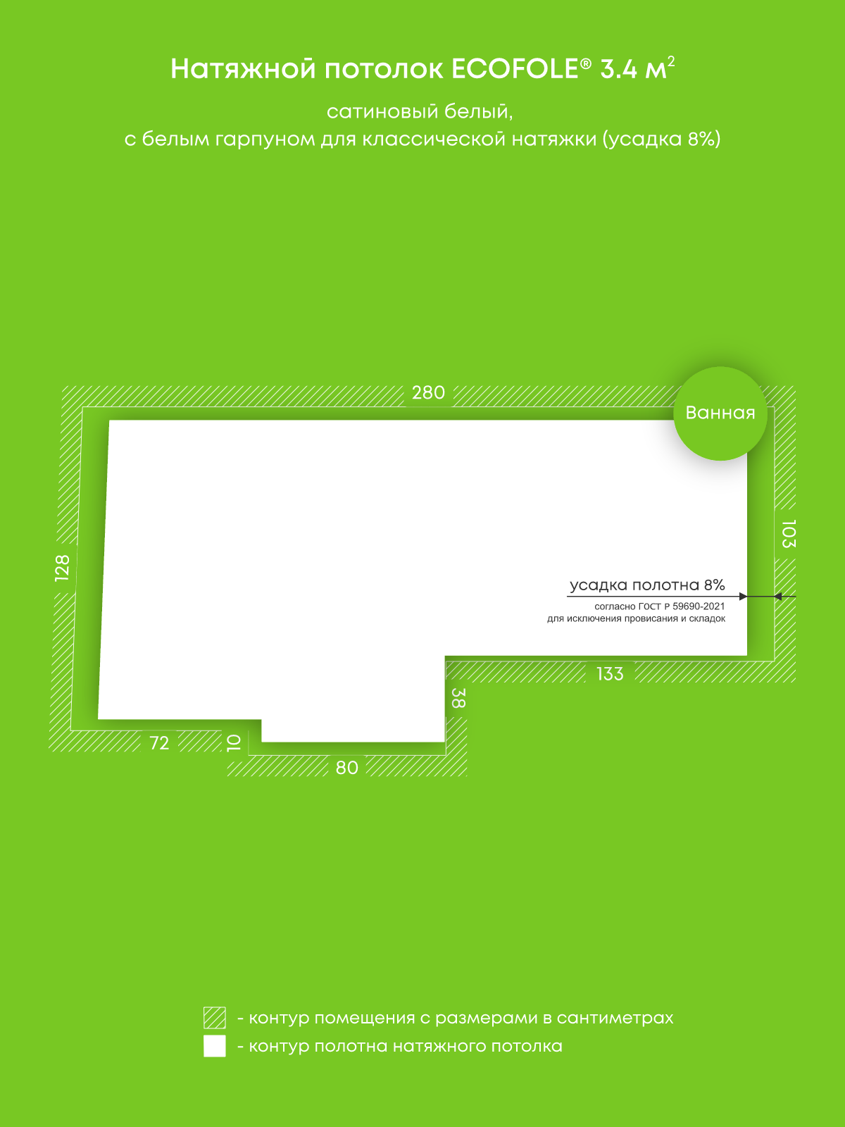 Натяжной потолок белый сатиновый, классической натяжки, изготовленный по индивидуальным размерам покупателя, для помещения площадью 3.4 м2