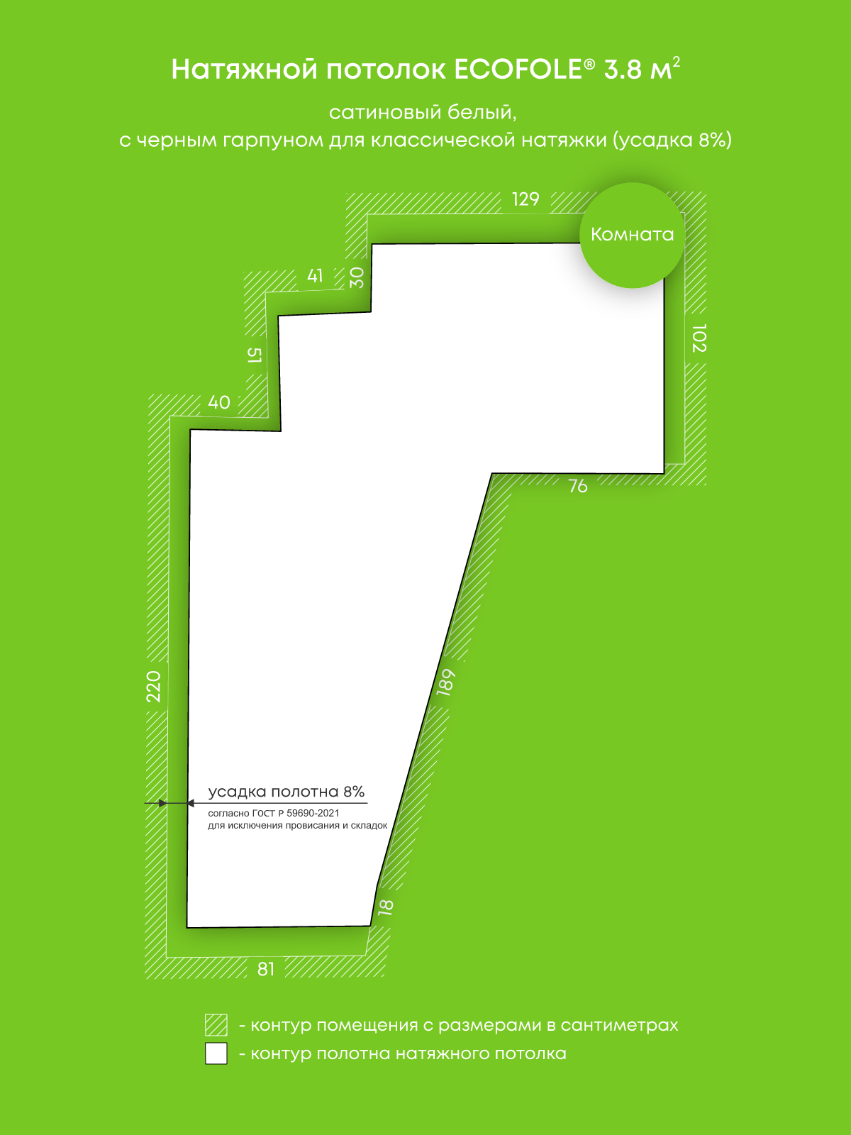 Натяжной потолок белый сатиновый, изготовленный по индивидуальным размерам покупателя, для комнаты площадью 3.8 м2