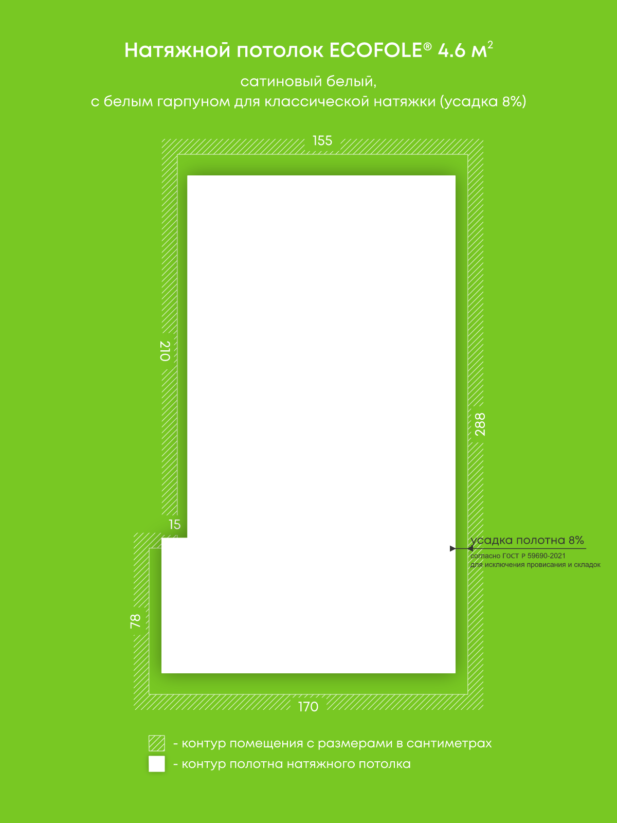 Натяжной потолок белый сатиновый, изготовленный по индивидуальным размерам покупателя, для помещения площадью 4.6 м2