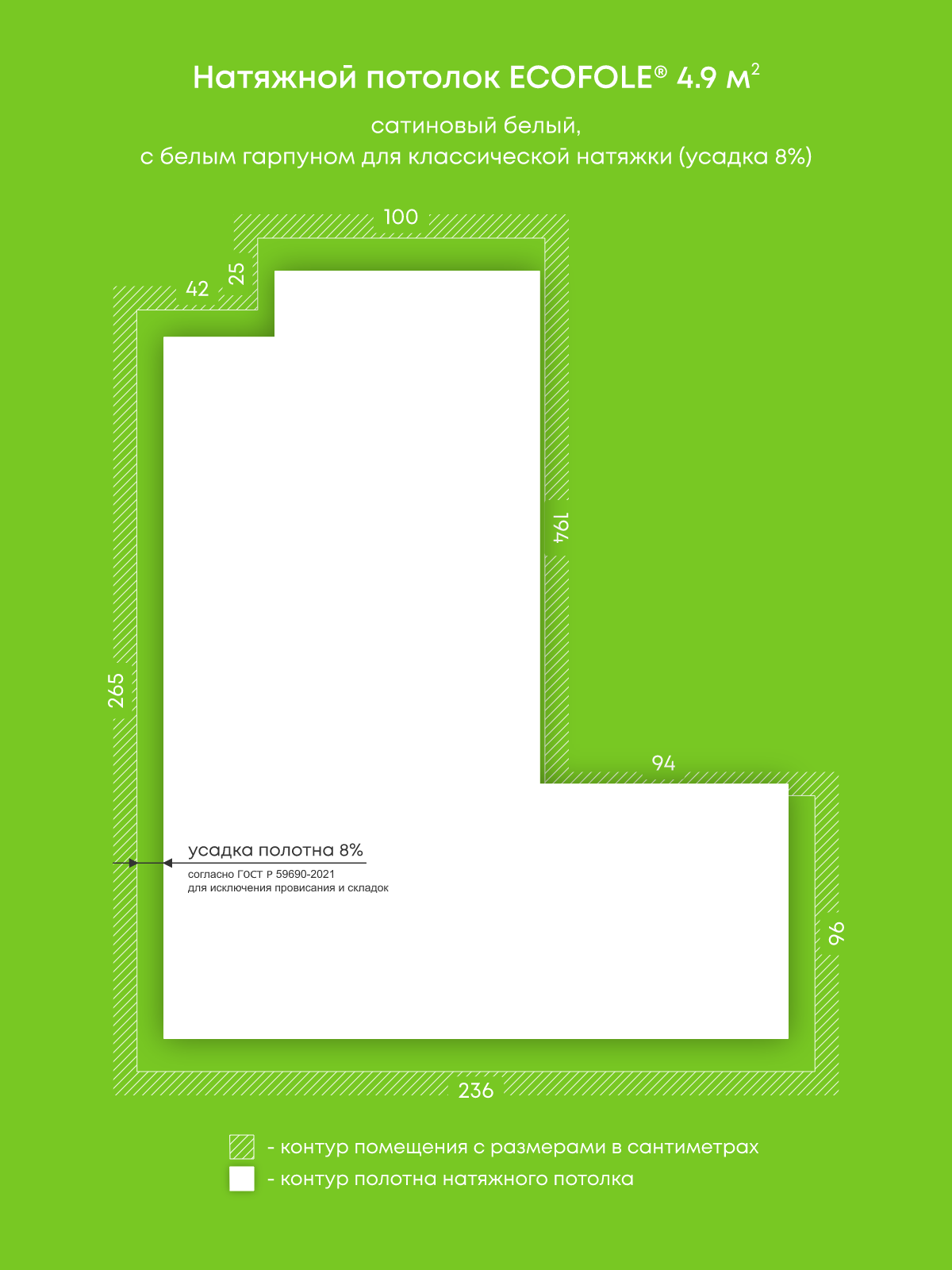 Натяжной потолок белый сатиновый, изготовленный по индивидуальным размерам покупателя, для помещения площадью 4.9 м2