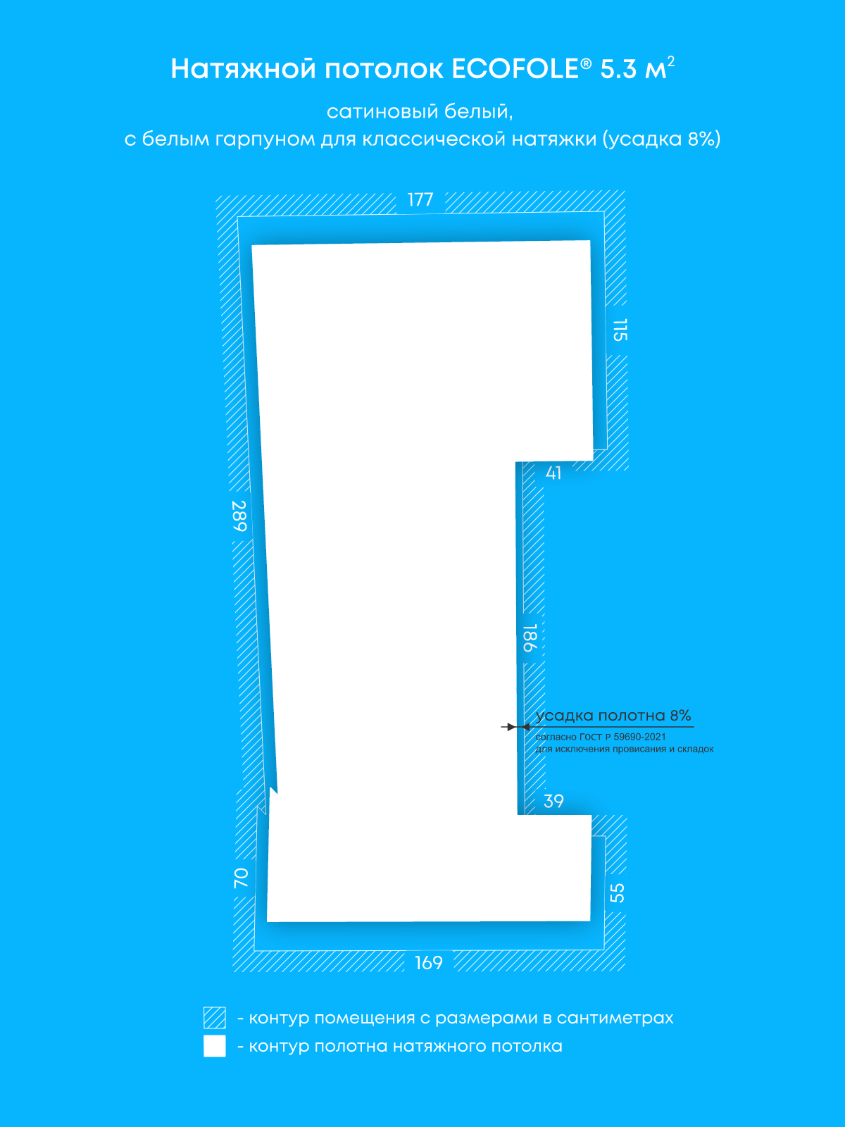 Натяжной потолок белый сатиновый, изготовленный по индивидуальным размерам покупателя, для помещения площадью 5.3 м2