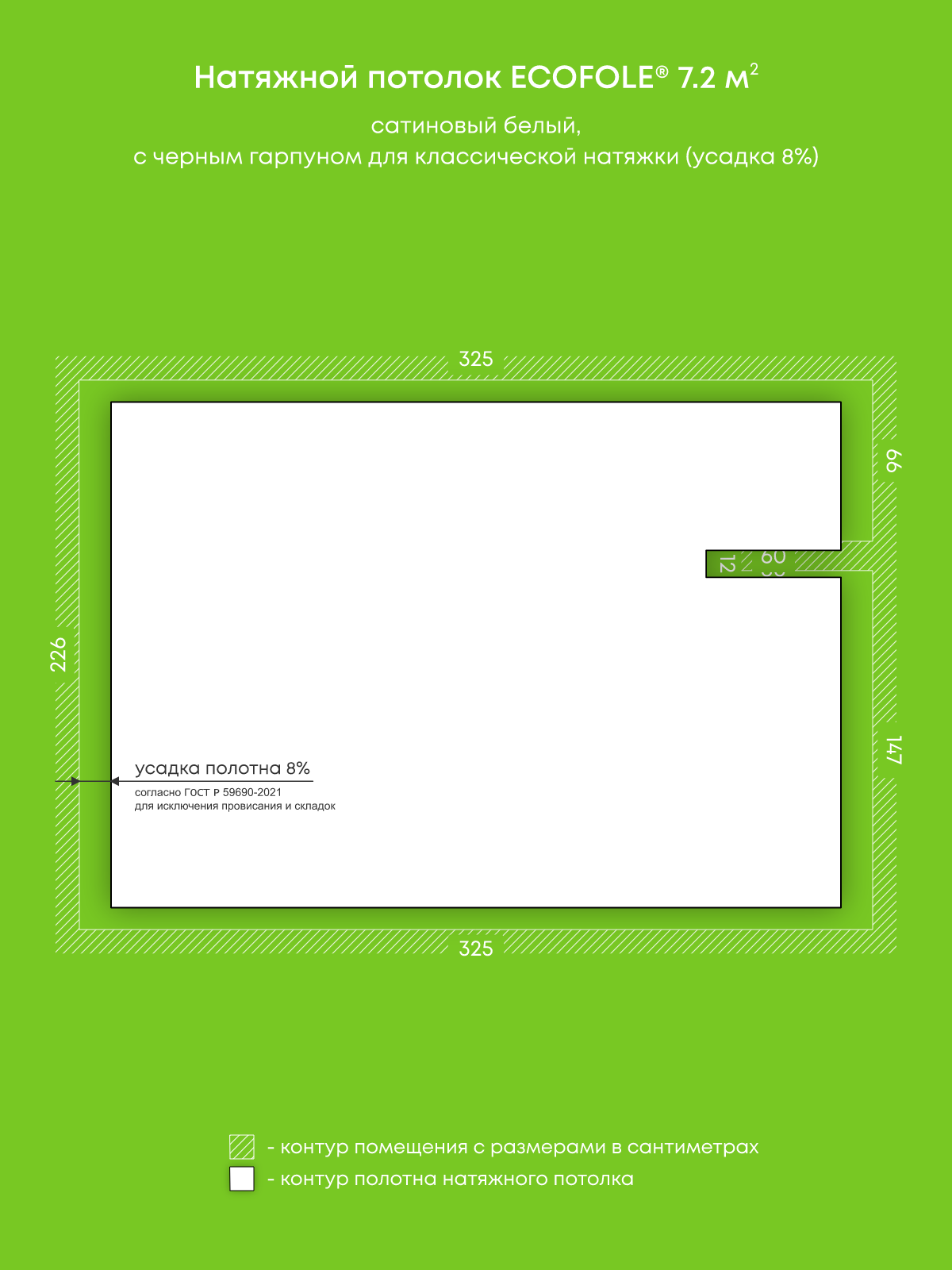 Натяжной потолок белый сатиновый, изготовленный по индивидуальным размерам покупателя, для помещения площадью 7.2 м2