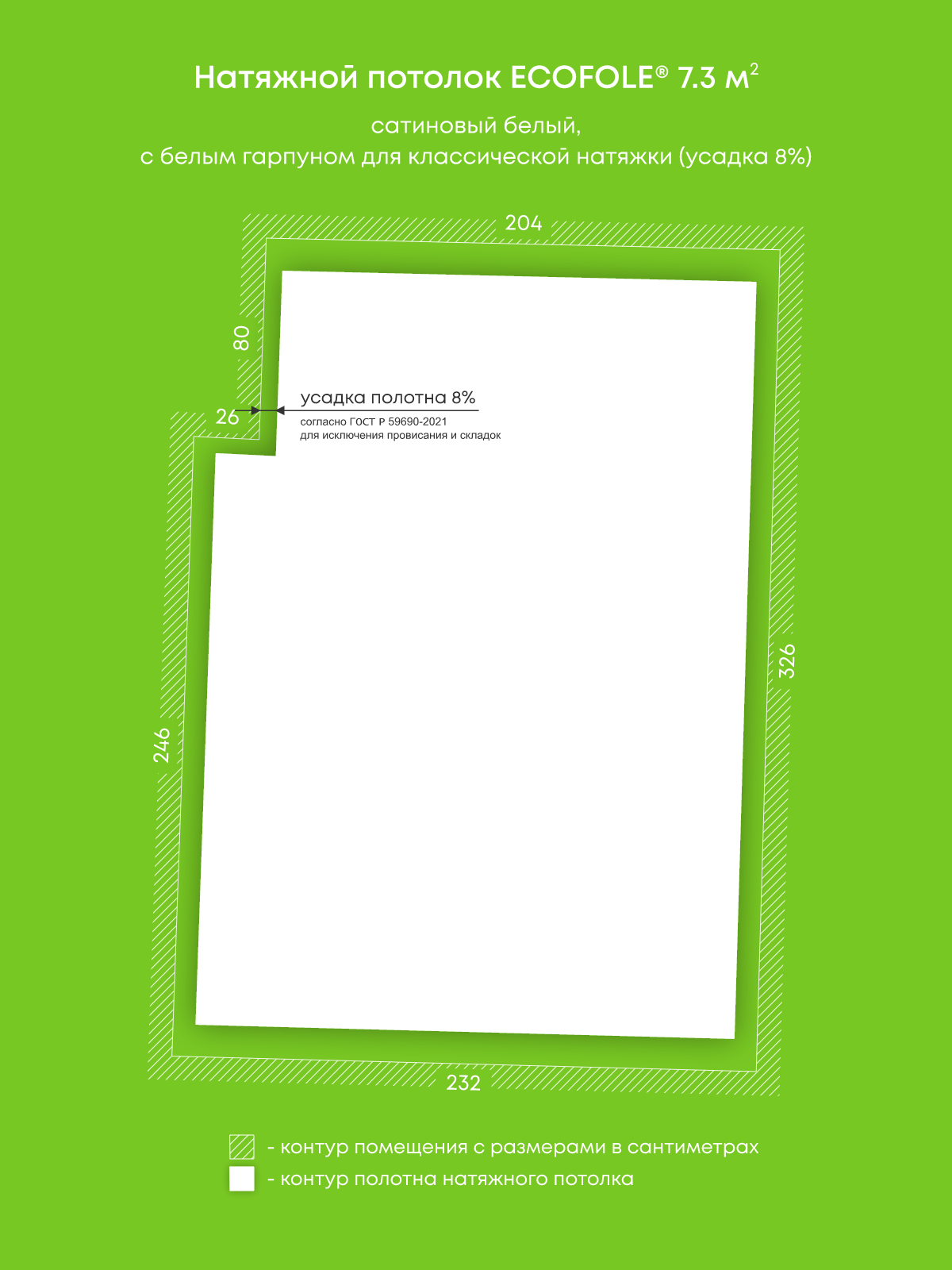 Натяжной потолок белый сатиновый, изготовленный по индивидуальным размерам покупателя, для кухни площадью 7.3 м2