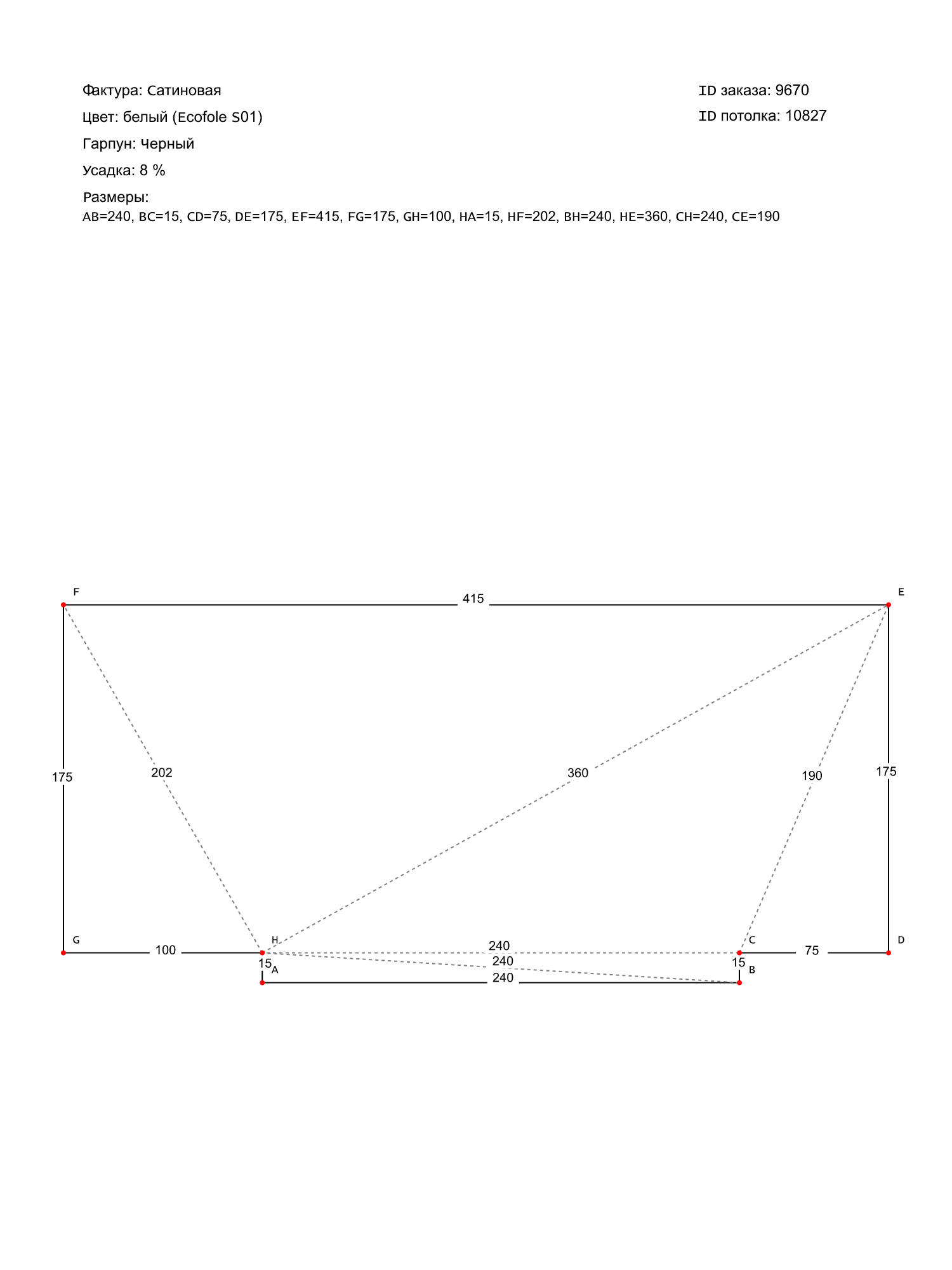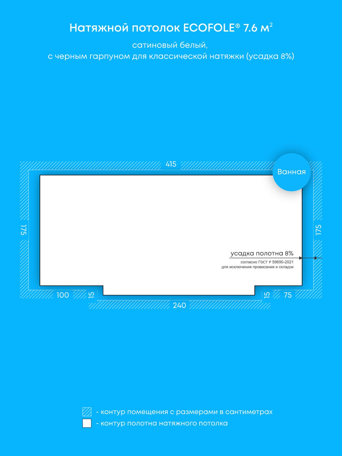 Натяжной потолок белый сатиновый с черным гарпуном, классической натяжки, изготовленный по индивидуальным размерам покупателя, для помещения площадью 7.6 м2