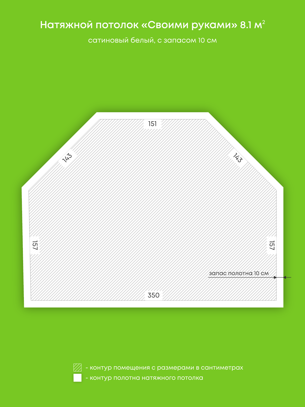 Натяжной потолок белый сатиновый, изготовленный по индивидуальным размерам покупателя, для комнаты площадью 8.1 м2