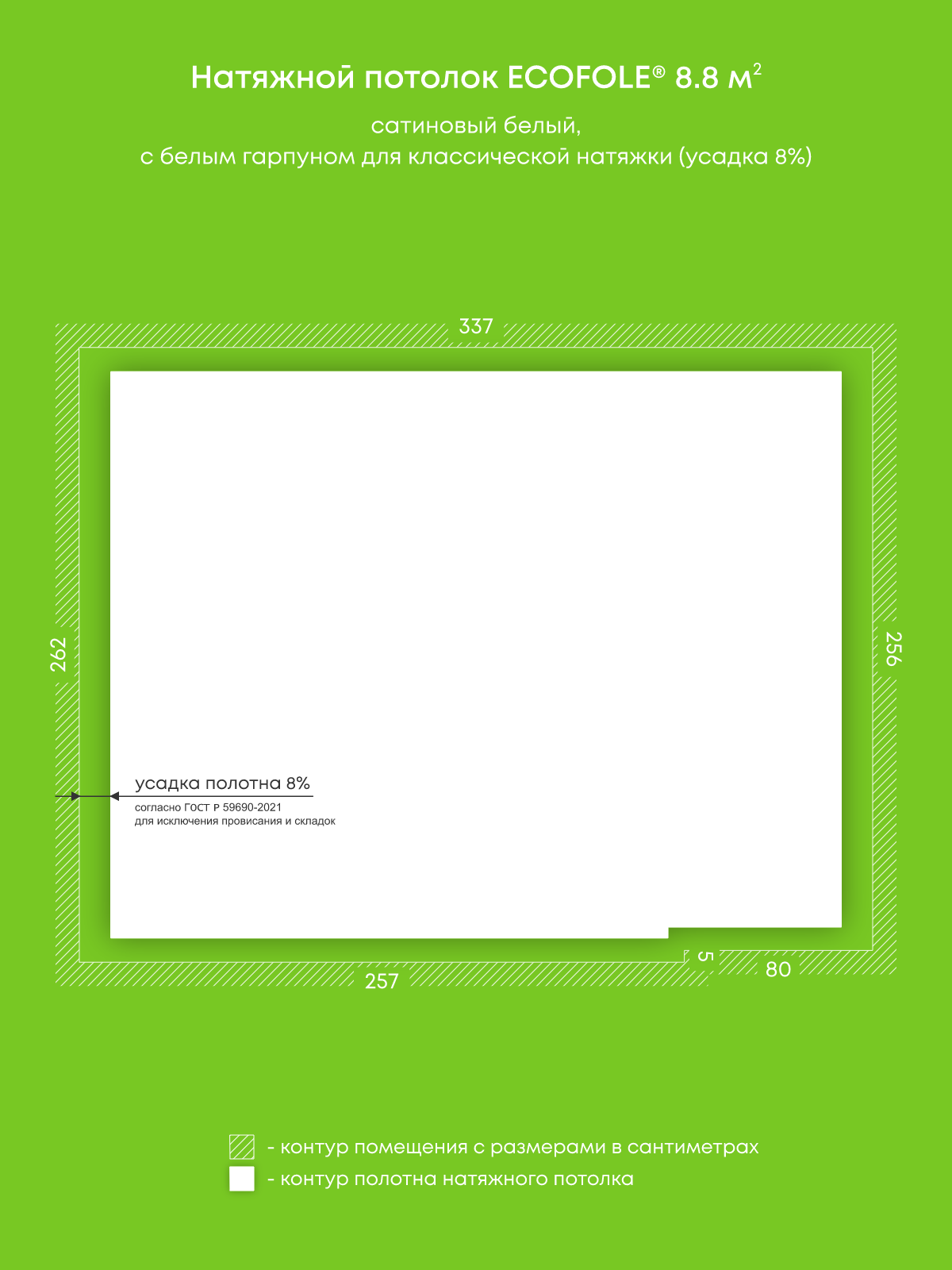 Натяжной потолок белый сатиновый, изготовленный по индивидуальным размерам покупателя, для помещения площадью 8.8 м2