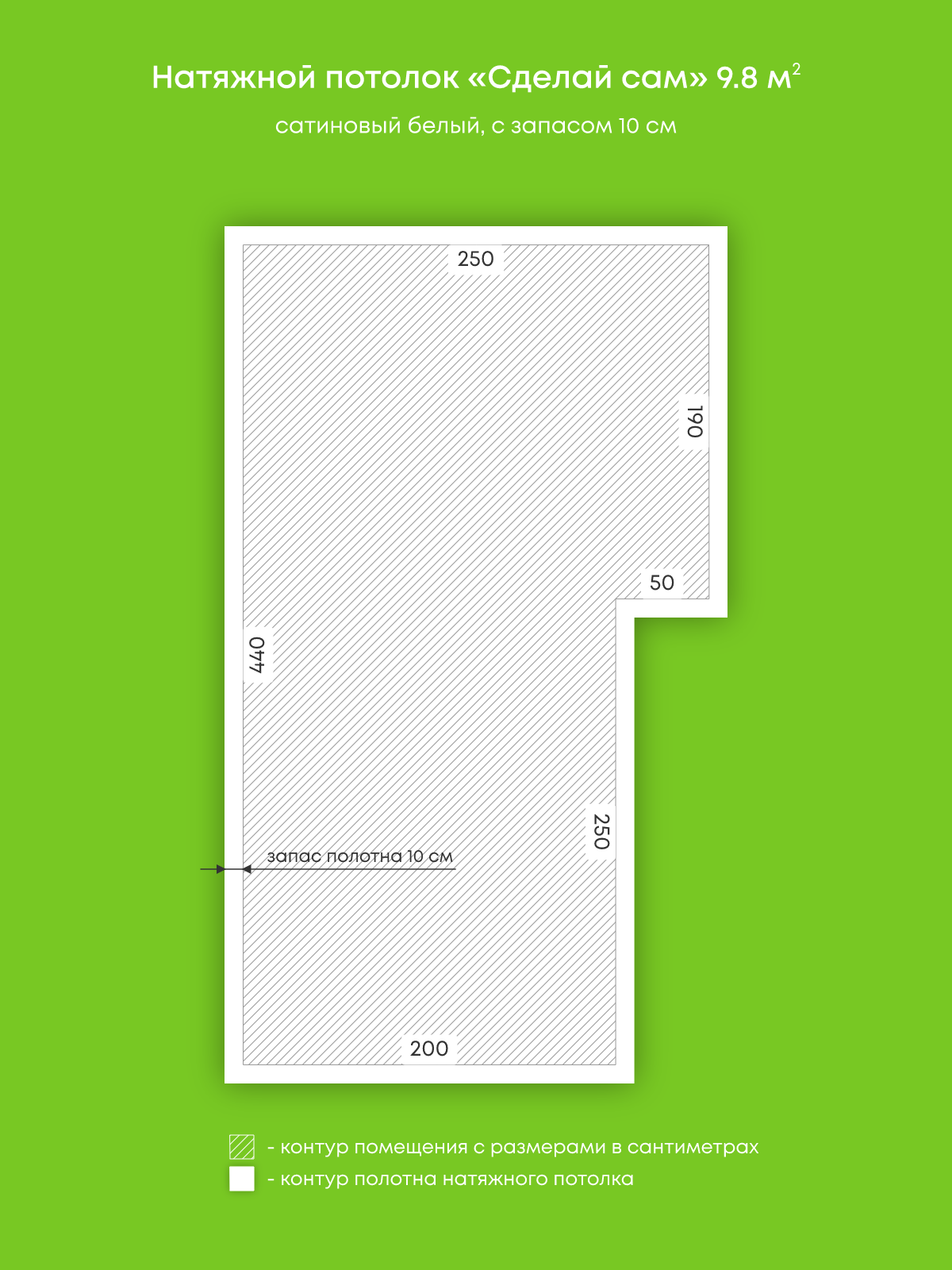 Натяжной потолок белый сатиновый, изготовленный по индивидуальным размерам покупателя, для помещения площадью 9.8 м2